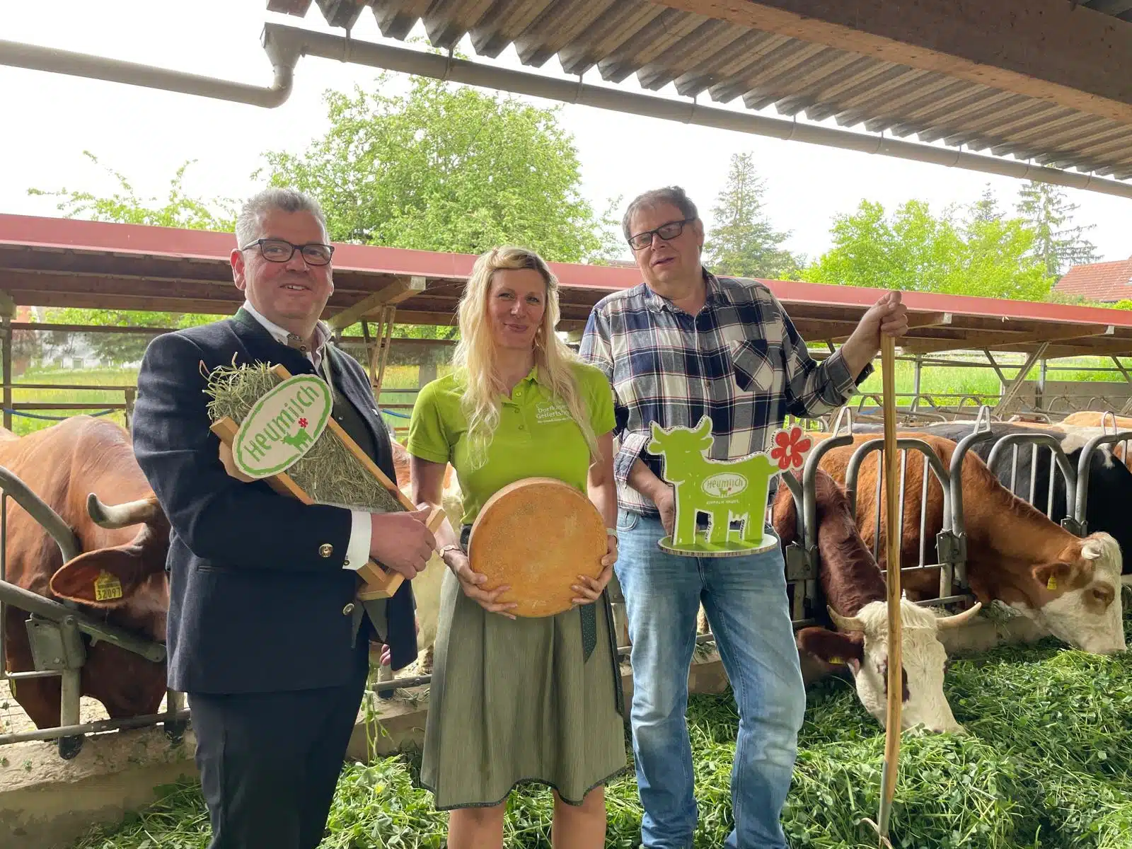 v.l.n.r.: Vorsitzender Markus Fischer, ARGE Heumilch Deutschland; Nadine Bühler, Geschäftsführerin der Dorfkäserei Geifertshofen AG; Jens Keim, Heumilchbauer der Dorfkäserei Geifertshofen AG ©ARGE Heumilch