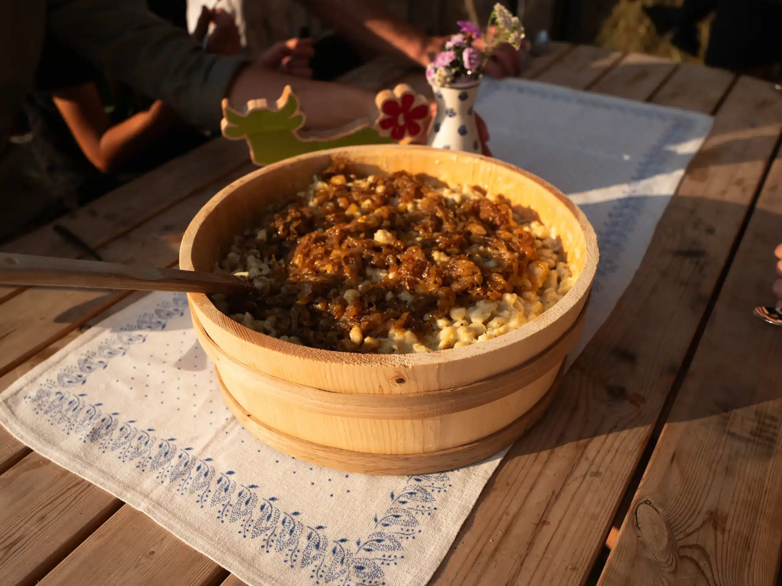 Für die Knöpfle alle Zutaten zu einem Teig schlagen (bzw. kräftig kneten). Den Käse reiben. Eine Holz-Gepse (oder alternativ eine Ofenform) im Ofen bei ca. 120°C erwärmen.