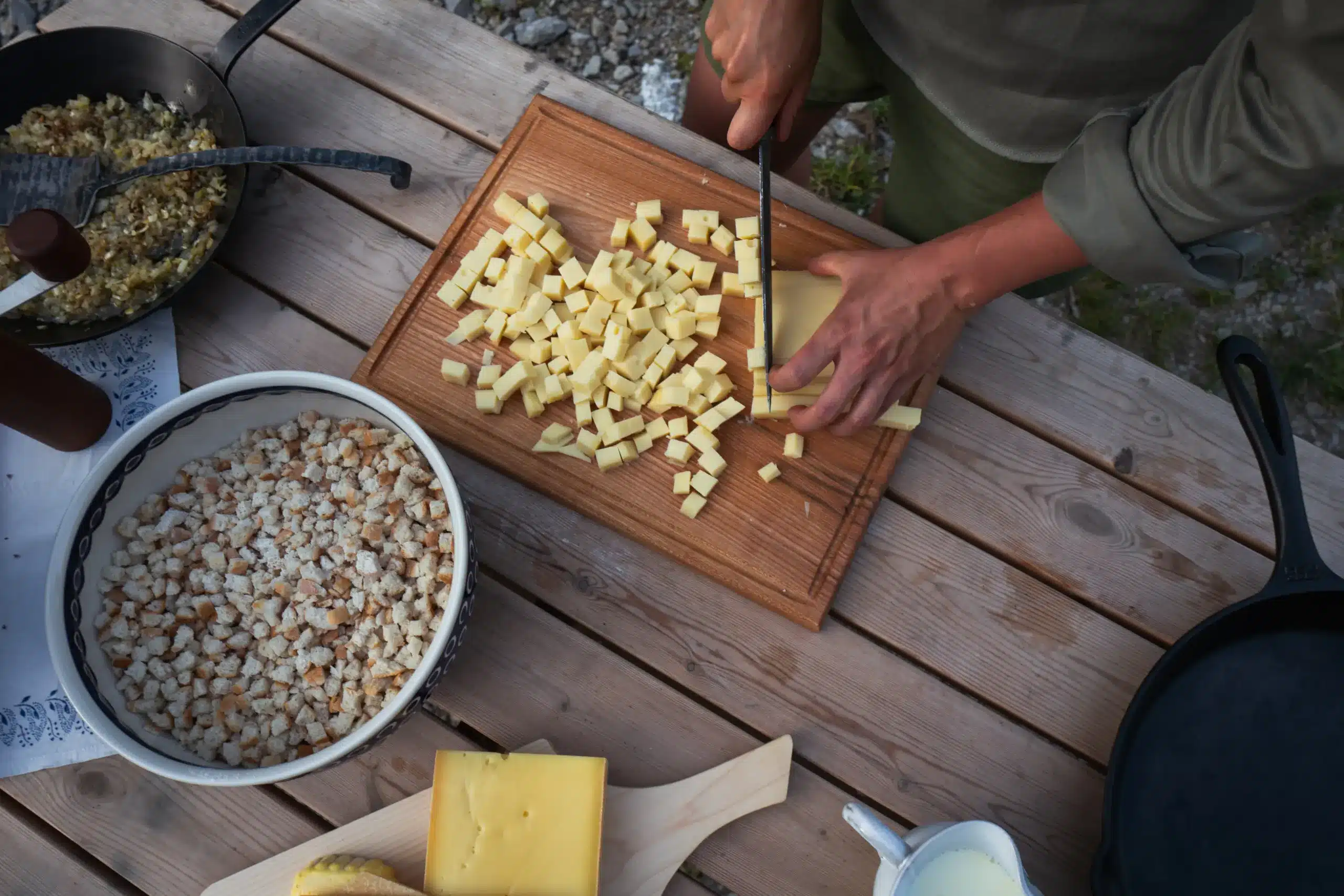 Die Zwiebel fein schneiden und den Knoblauch hacken. Die beiden Käsesorten in kleine Würfel schneiden. Die Kräuter fein hacken.